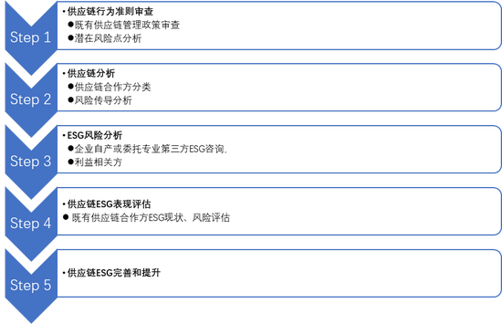 1.企业自查或委托专业第三方ESG咨询,明确供应链相关产业重要ESG风险点,进行直接和间接风险分析。通过内部核查、外部资料参考、尽职调查等方式,从内部明确供应链ESG实践、风险和能力提升需关注的要素。