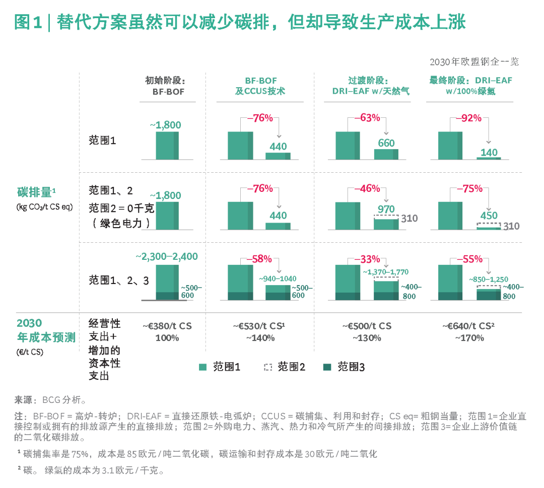根据模型预测,若在欧洲和英国实施碳捕集技术,生产每公吨钢所需的碳排量会从现在的1.8吨减少到2030年的0.4吨(仅限范围1和2的排放量)。钢厂的运营成本和资本性支出会增加40%,即每公吨钢的成本增加150欧元。相比之下,采用绿氢直接还原铁和电弧炉方案将在2030年把每公吨钢产生的碳排量降低至约0.1吨,而成本增加70%,即每吨钢的成本增加260欧元。数字可能会变化,具体取决于“碳边境调节机制”或“排放交易体系”的免费排放配额政策(参阅图1)。