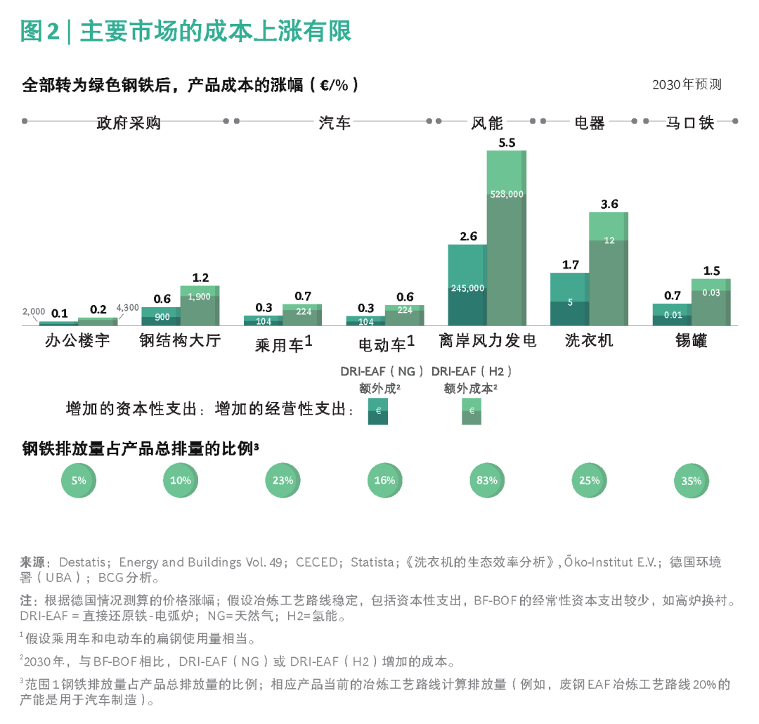 绿色钢铁技术(如利用绿氢直接还原铁和电弧炉技术)将大幅增加每吨钢的生产成本,但在许多消费品行业,钢铁价格的上涨对终端消费品价格的上涨影响有限(参阅图2)。