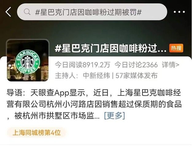 6月6日晚间,#星巴克门店因咖啡粉过期被罚#话题登上热搜榜。