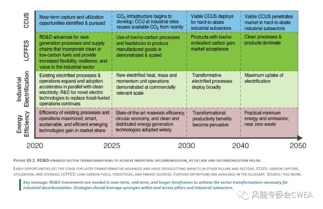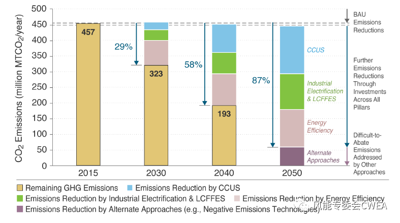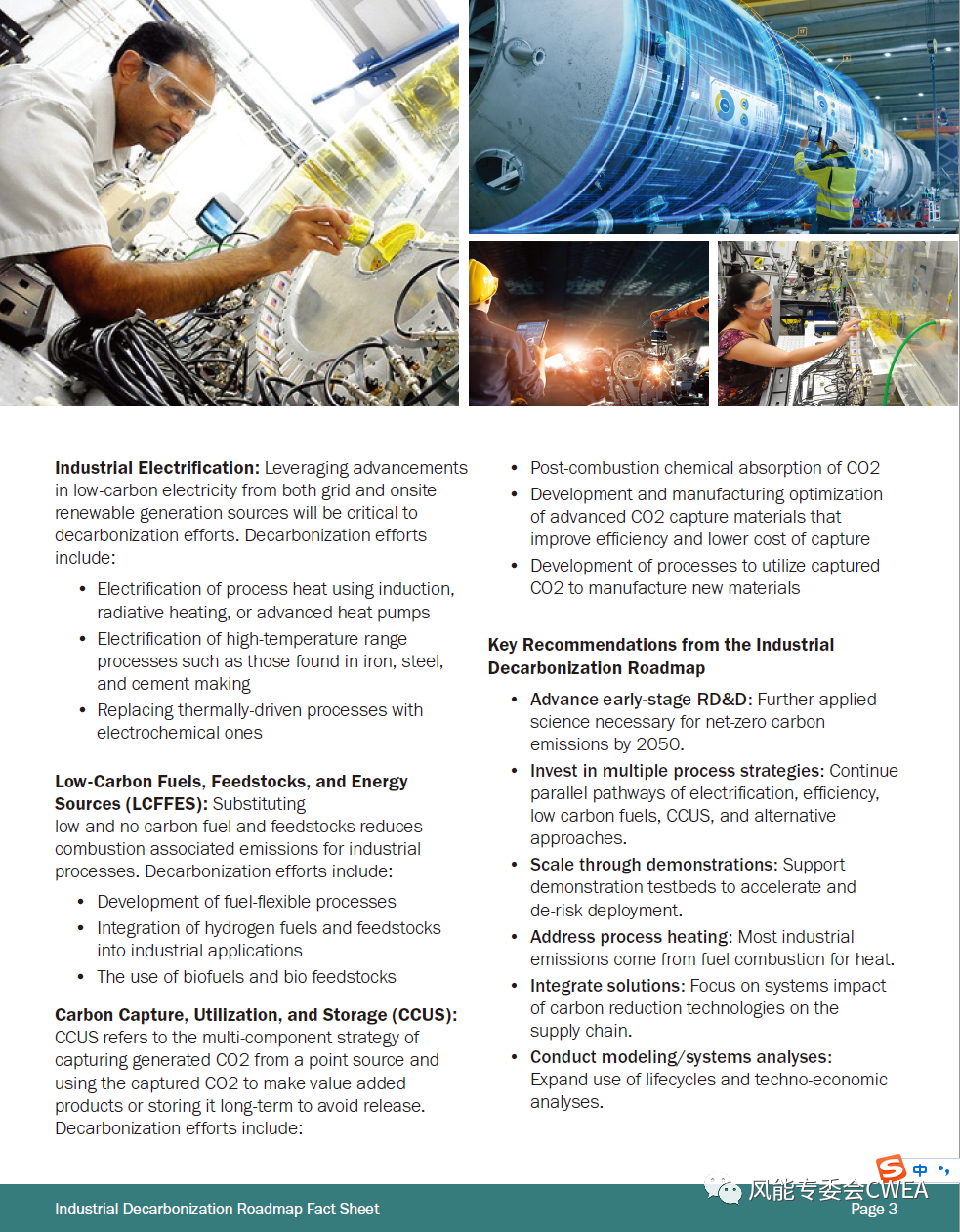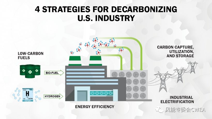 2、工业电气化(Industrial Electrification):利用电网和现场内部可再生能源发电资源在低碳电力方面的进步对于脱碳工作至关重要。具体的脱碳方法包括: