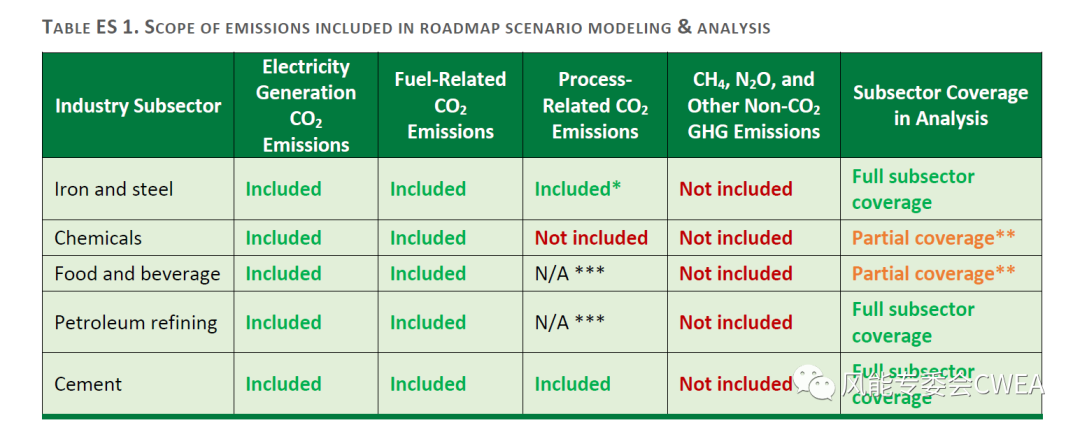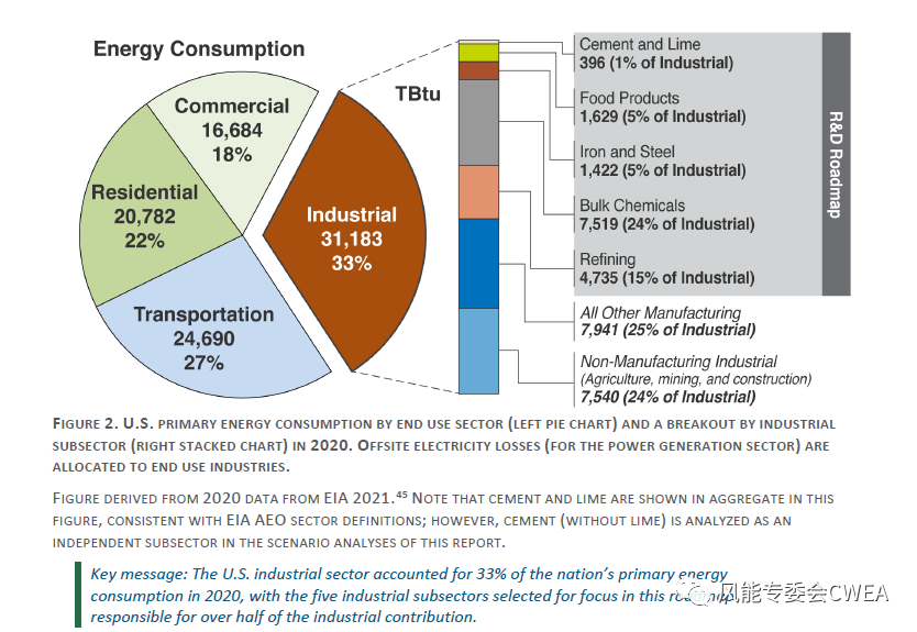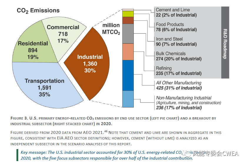 数据来源:“ Annual Energy Outlook 2021 with Projections to 2050”,美国能源信息署,2021 年 2 月 3 日。注:路线图分析仅涵盖部分化学品(氨、甲醇、乙烯和 BTX)以及食品和饮料(湿玉米碾磨、大豆油、蔗糖、甜菜糖、液态奶、红肉制品加工和啤酒生产)子行业。工业占美国一次能源相关二氧化碳排放量的 30%,约13.6 亿吨(1360 MT,2020 年)。工业脱碳路线图重点关注五个二氧化碳排放量最高的行业,在这些行业中,采用工业脱碳技术可以在全国范围内产生最大的影响,包括:炼油、化工、钢铁、水泥以及食品和饮料。这些行业约占美国工业部门与能源相关二氧化碳排放量的 51%,占美国经济范围内二氧化碳总排放量的 15%。