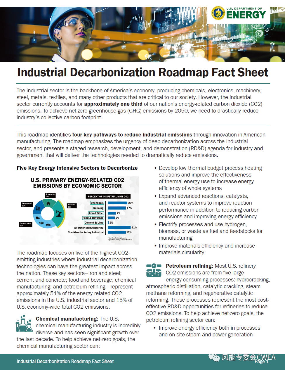 美国能源部发布《工业脱碳路线图》,斥资1.04亿美元资助减排技术