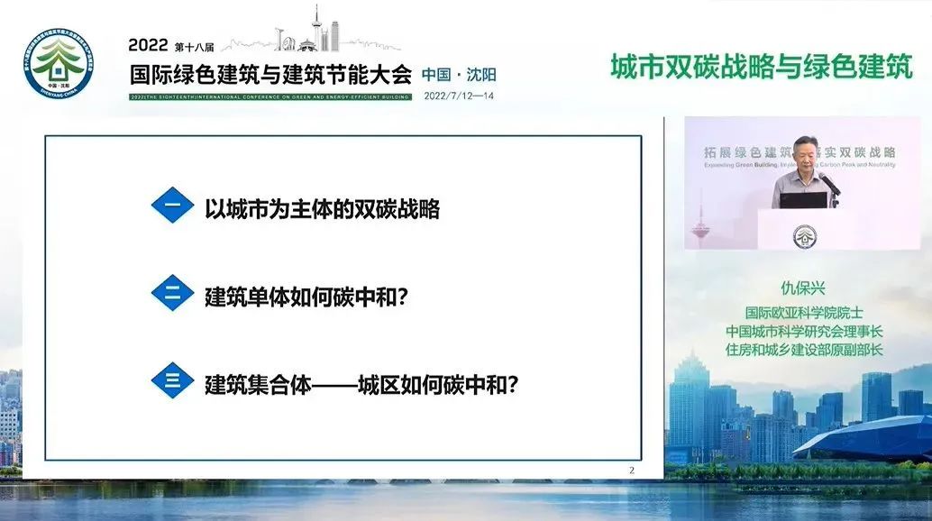 本期内容将分享欧亚国际科学院院士、中国城市科学研究会理事长、住房和城乡建设部原副部长仇保兴在“2022(第十八届)国际绿色建筑与建筑节能大会”中《城市双碳战略与绿色建筑》的演讲报告。
