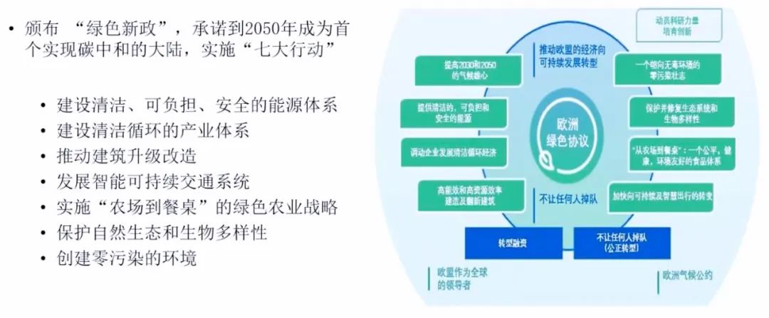 所以欧洲从1990年开始碳达峰就开始关注这个规则制定,制定了一系列的法律,明确目标、明确能源安全和法律,循环经济的法律,高效率的转型、高效融资,所以他希望成为全球的规则制定的。