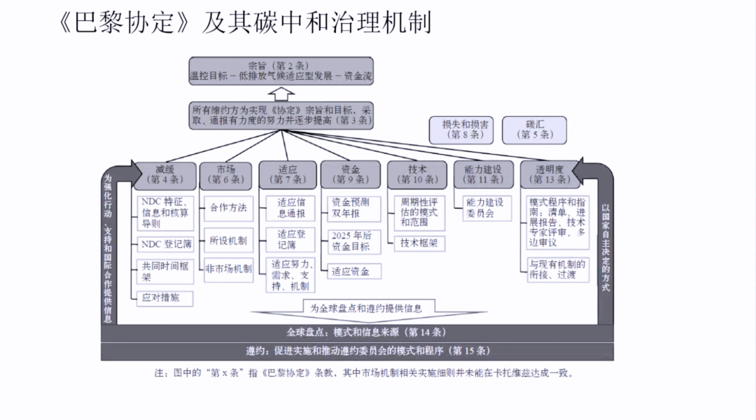 所以我们看巴黎协议的话,它的几个基本的支柱就是第四条是减缓,它有信息和核算,有登记应对措施。 第六条是市场,市场的合作设置机制非市场机制,第七条是信息通报,第九条是资金,就是需要预测的资金以及资金怎么来,第十条是技术,我们怎么样来发展技术,技术评估以及怎么沟通交流,第11条是能力建设,那么第13条是透明度,就是这个7条是巴黎协议的基本治理机制的一个框架,那么提供了一个考虑全球气变整体的几个主要的制约因素,把这个给健全了。所以《巴黎协定》这个7大支柱我觉得还是很重要的。