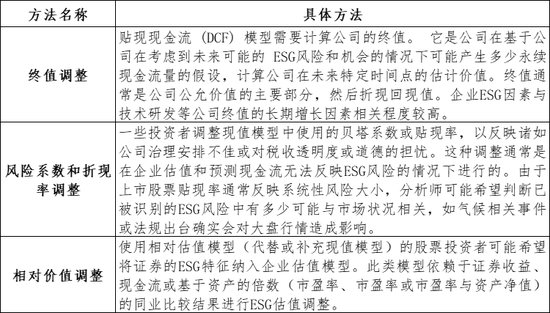 在ESG调整企业估值部分,UN PRI着重介绍了终值调整、风险系数和折现率调整以及相对价值调整3种方法。
