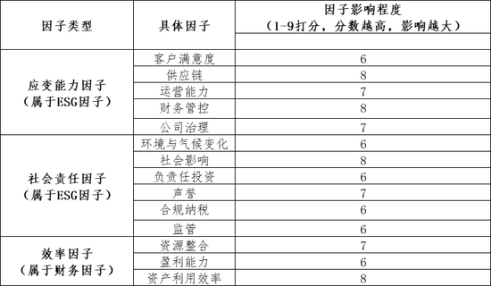 普华永道将影响企业估值的因子分为三类,分别为效率因子(即传统财务因子)、应变能力因子和社会责任因子,应变能力因子和社会责任因子均为ESG因子。应变能力因子包括客户满意度、供应链、运营能力、财务管控和公司治理5个指标。社会责任因子包括环境与气候变化、社会影响、负责任投资、声誉、合规纳税和监管6个指标。