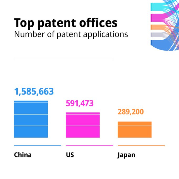 在2021年全球范围内的总共340万件专利申请中,中国国家知识产权局在2021年受理了159万件专利申请,这一数量与排名第二至第十三的12个主管局的总和相近。紧随中国之后的是美国(591,473件)、日本(289,200件)、大韩民国(237,998件)和欧洲专利局(188,778件)的主管局。这五大主管局受理的申请数量共占世界总量的85.1%。