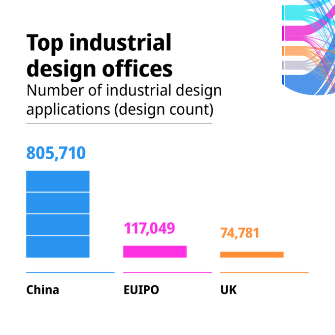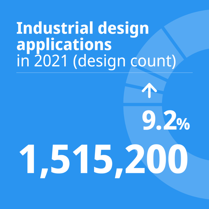 2021年,全球共提交了约120万件工业品外观设计申请,其中包含150万项外观设计。2021年,外观设计的数量增长了9.2%。2021年,中国国家知识产权局受理的申请中包含了805,710项外观设计,占世界总量的53.2%。其次是欧盟知识产权局(117,049项)、联合王国(74,781件)、大韩民国(69,248件)和土耳其(65,924件)。由于联合王国脱欧,联合王国主管局在2021年受理的外观设计申请比2020年增加了2.3倍,是外观设计申请数量方面在2021年第三活跃的主管局,一年内在世界排名中上升了四位。