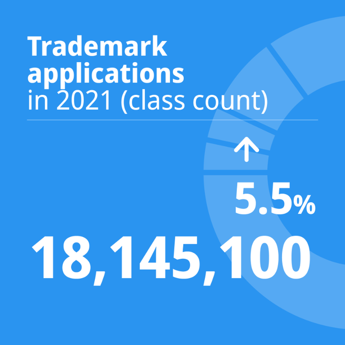 2021年,全球约有1,390万件商标申请,涵盖了1,810万个类别。申请中指定的类数在2021年显著增长了5.5%,连续第12年实现增长。在排名前20位的主管局中有18个主管局的商标申请活动量有所增长。