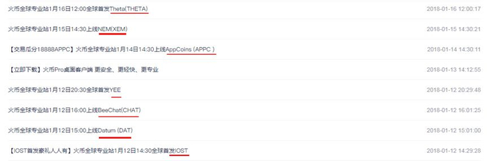 以国内交易平台“火币网”为例,仅在火币官网公告第一页便可以看出,最近5天就上线了7种新币,均为ICO项目代币。