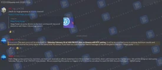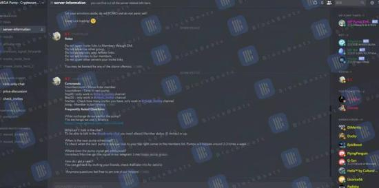 庄家目前一般在 Discord 和 Telegram 上建立两个公共房间/频道,随即开始宣布‘这是一个大庄家建的群,有非常雄厚的比特币和以太坊资本,准备对某个平台的虚拟货币进行拉升操作,请留意。’