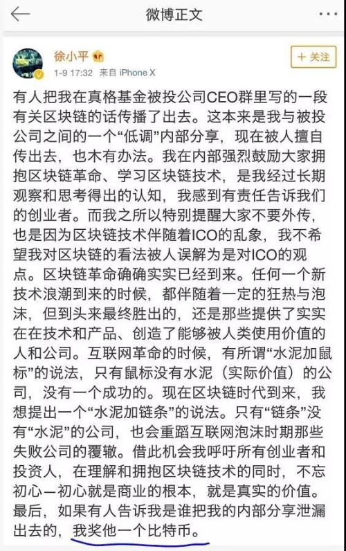 此前,每日经济新闻也报道过,徐小平在群里一段“鼓励拥抱区块链”的讲话外泄,曾悬赏一个比特币“破案”。
