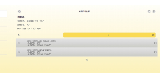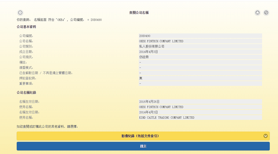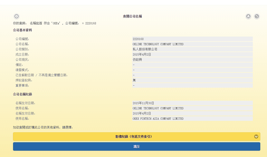 香港工商信息查询”OKEx“,可以检索到2家工商企业仍在运行,但未公开披露其公司股东信息。有兴趣的读者可以检索一下:
