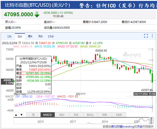 12月4日,比特币并未止住颓势,在一举跌破50000美元关口后,短时插针至42000美元附近,日内跌幅超10000美元,创9月30日以来的最低价。