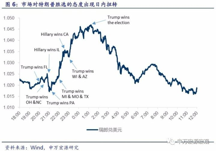 从这一点来说,当发生风险事件时投机避险货币升值也是有风险的。第一,市场对风险事件的反应往往非常迅速,无论是风险的发生还是消退,当下的价格基本已经price in了风险影响甚至市场预期本身。第二,当风险的短期影响和货币本身长期趋势并不一致时,若风险因素的影响弱于长期因素的影响,避险货币未必一定体现出避险特征。第三,市场对于风险事件本身的理解往往也变化非常快。一个极端又非常典型的例子就是2016年美国大选日市场对于特朗普当选是否是风险事件的快速转换。2016年11月8日大选日各州开票期间,特朗普在关键州和摇摆州的每次获胜均引发了市场恐慌情绪上升,瑞郎等避险货币和黄金等避险资产价格上行。然而当特朗普最终赢得大选这个最大的黑天鹅飞出后,市场对特朗普的态度却发生了180度的转变,不仅避险资产价格迅速回落,其后更是上演了风险资产大涨的特朗普行情。