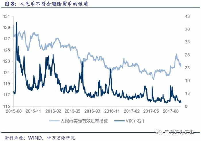 人民币在可见的未来都难以成为避险货币。人民币并未表现出避险特征,当风险事件出现导致VIX向上脉冲时,人民币汇率指数基本没有跟随上升,走势基本独立,部分情况下甚至反向波动。这意味着市场对人民币的理解并非避险货币,更主要还是新兴市场货币。从必要条件来看,人民币离完全可自由兑换和自由浮动还有较大距离,外汇管制仍然存在,资本项目开放的推进还较慢。而从货币安全性方面考虑,中国仍是新兴市场国家,经济结构仍需优化,而无论是金融市场的完善程度还是法治化程度都有待提高。