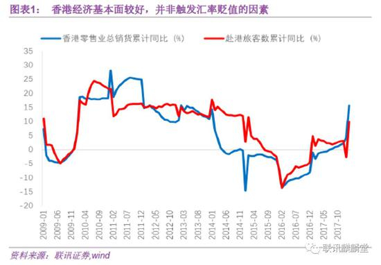 首先可以排除经济基本面的因素。2017年香港GDP增速为3.8%,是2012年以来的最好表现。由于港币贬值,尤其是2017年港币兑人民币汇率大贬了7%,带动赴港旅游和消费明显提升。