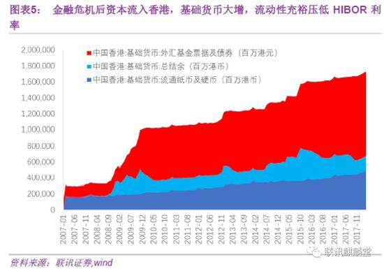为何香港的政策利率向市场利率传导较弱呢?金融危机后的资金持续流入是主要原因。从香港基础货币的三大组成看,流通纸币及硬币稳步增长,总结余在2015年达到顶点后逐步回落,而外汇基金票据及债券在美联储的几次QE中出现跳跃式增长。