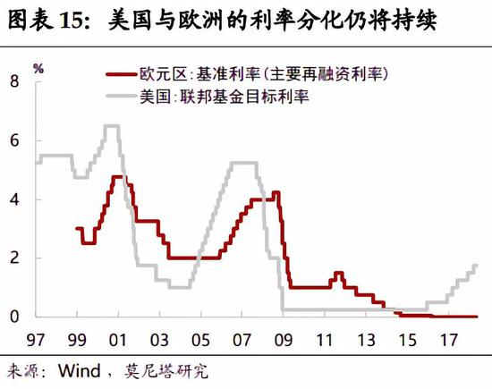 对应当前形势,美联储与欧央行的货币政策政策分化仍将持续,意味着美欧利差仍有走扩的基础(图表15)。在此过程中,美债收益率的影响因素中也许还需要加入第五条——美元指数的强弱。