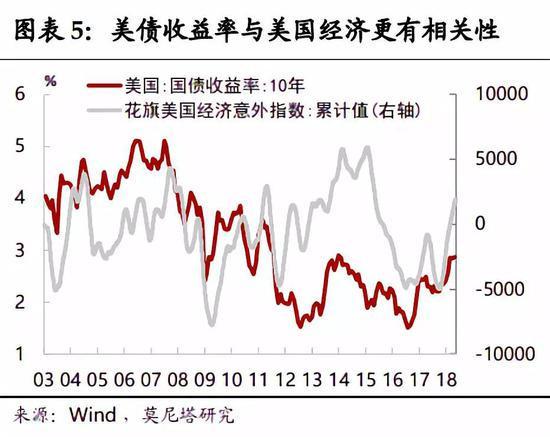 分别厘清了美元和美债的决定因素之后,我们可以对美元和美债之间的关系有更清晰的认识。今年4月下旬以来,美元指数和10年期美债收益率同步显著上行。对此,市场流行的观点是美债收益率上行助推了美元的反弹。从前文分析可知,这个逻辑链条有值得商榷的成分。在很大程度上,美元的决定因素是比较纯粹的,它取决于美国经济“一枝独秀”的程度。而美债的影响因素则较为复杂,它是美国经济基本面、货币政策和海外(尤其是欧洲)影响的结合体。