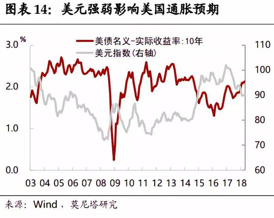 美元除了通过资本流动影响美债外,还通过通胀预期对美债施加影响。弱美元会向美国输入通胀,而强美元有助于压低美国通胀。这一点从10年美债收益率所体现的通胀预期,与美元指数之间的反向相关性中可得到佐证(图表14)。这也会进一步加强美元与美债收益率之间的反向关系。