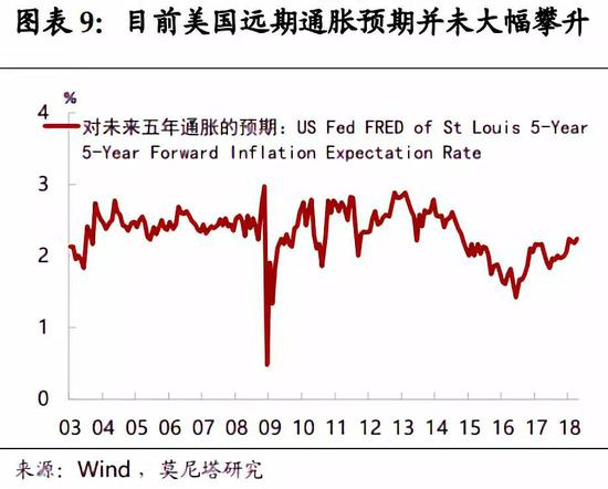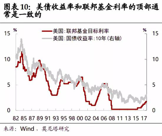 当前,美联储仍然遵循前瞻指引(forward guidance)的原则,与市场进行清晰地沟通。因此,预计本轮加息也会大致止步于联邦基金利率与10年美债收益率持平的位置。目前,美联储对联邦基金利率的长期预测值(Longer run)是2.9%,并认为2020年联邦基金利率将冲高至3.4%。静态预测,本轮美债收益率的高点可能在3.4%左右。当然,触顶时点依然具有很大的不确定性,这不仅要看美国经济复苏的平稳程度,也要看美联储持续加息下金融市场和实体经济的响应程度。