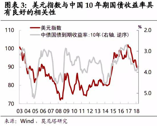 长期以来,美元指数与中国10年期国债收益率呈现出异常良好的反向关系,正是因为二者都具有良好的基本面属性。当美元强势时,往往意味着全球经济相对偏弱,作为大型经济体的中国自不例外,基本面角度是利好中国债市的。而在2015年之后的美元强势中,尽管美联储货币政策相对收紧,但日央行和欧央行相继为全球流动性蓄力,中国债市仍然面临友好的货币环境。当美元走弱时,情况相反(图表3)。