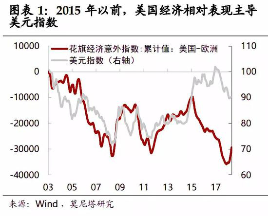 1、美国经济的相对表现。我们将花旗经济意外指数累计加总,因其值为正代表经济超预期,为负代表经济不及预期,累计值可以作为对经济趋势的良好刻画。再将美国与欧洲的情况做差,以此刻画美国经济的相对表现。2015年之前,该指标与美元指数之间具有良好的同步变动关系:美国经济的相对优势伴随美元走强,美国经济的相对弱势则伴随美元走弱(图表1)。注意到目前美国相对欧洲的景气度尽管有所回升,但仍处于2003年以来的低位,当前美国经济一支独秀的程度仍然偏弱且尚待观察。美元指数在2015年之后所表现出的强势另有原因。