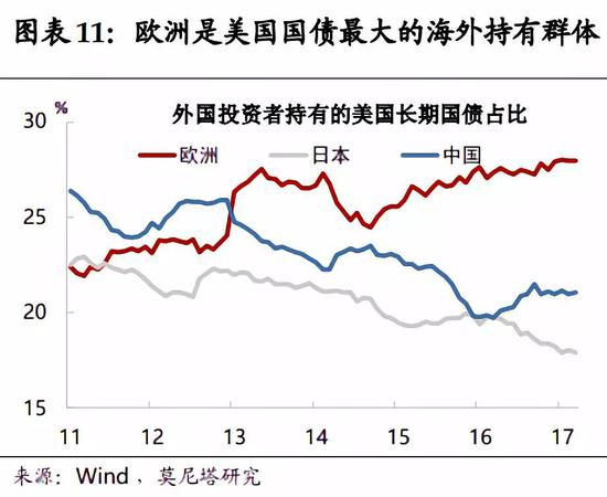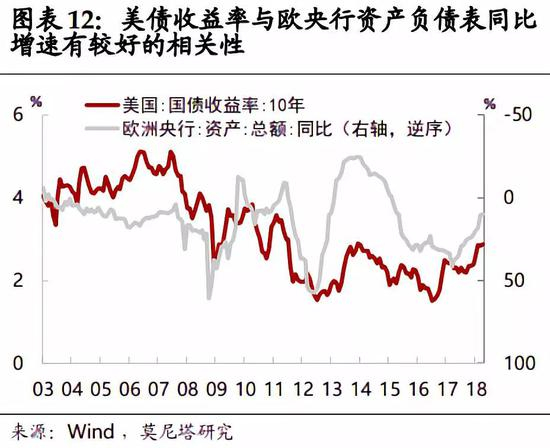 4、欧央行扩表速度。不同于其它国家债券市场,美元作为国际储备货币的地位,决定了美国国债拥有大量的海外持有者,2018年一季度其占比达到42.1%。在海外持有者中,欧洲是当前持有美债最多的经济体,2018年2月其在美债的海外持有中占比达到28%(图表11)。欧洲持有美债的上升,与欧央行量化宽松的推进有关。数据显示,美债收益率与欧央行资产负债表的扩张速度存在反向相关关系(图表12)。换句话说,尽管美联储加息缩表给美债收益率带来上行压力,但欧央行宽松进程的延续增加了美债的买盘。2017下半年以来,欧央行资产负债表扩张速度开始明显放缓,也是助推美债收益率上行的重要因素。