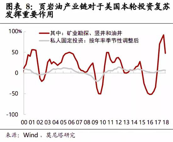 2、美国通胀预期。在通胀预期里面,一个最重要的成分是原油价格。以10年期美债的名义收益率减去实际收益率,是刻画美国通胀预期的通行指标。2008年以来,通胀预期与原油价格走势高度相关,油价快速涨破80美元/桶,也是近期美债收益率快速上行的一大触发因素(图表7)。油价不仅影响通胀预期,也对美国经济复苏产生重大影响:2017年以来,美国经济的好转主要受到私人投资的带动,而在私人投资中页岩油产业链又贡献了近1/4的增长(图表8)。