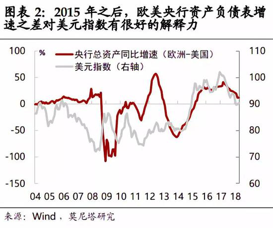 2、美联储资产负债表的相对增速。2014年美联储开始逐步退出量化宽松(QE),而欧央行从2015年开始启动量化宽松计划。这种货币政策步调的强烈分化,令美元指数在2014年8月到2015年3月快速拉升,从80上涨突破97。这段时间,美国经济的相对优势有所下降,但货币政策的显著差异主导了美元走势。2015年以来,欧央行与美联储的资产负债表增速差,对美元指数展现出更好的解释力,这是由全球“量化宽松”的特殊性造成的(图表2)。