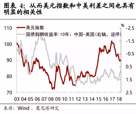 进一步引申可以发现,美元指数和中美利差之间通常也具有一定的反向关系。这似乎表征着,美债收益率与美元指数的相关性没有中债收益率好。强美元通常伴随中美利差收窄,弱美元则伴随中美利差走扩。2018年初以来,美元指数走弱而中美利差收窄的情况,在历史上是非常罕见的。“趋势回归”或许也是4月下旬以来美元指数强势反弹的一大动力源(图表4)。