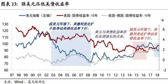 我们认为,美元和美债收益率的相关性实则相反:是美元影响美债,且强美元压低美债收益率、弱美元助推美债收益率(图表13)。1、在弱美元的环境下,美国资本市场的虹吸效应弱,此时美欧利差扩大也不能有效吸引资金进入美债市场,进而带动美债收益率下行,美欧利差会持续存在。这是2003-2007年之间发生的情况。2、在强美元的环境下,美欧利差扩大才能有效吸引资金进入美债市场,进而带动美债收益率下行,抑制美欧利差的扩大。这是2014下半年到2016上半年之间的情况。3、在2008下半年到2014上半年的美元震荡期,美元指数与美债收益率呈现出此消彼长的反向相关:弱美元的环境助推美债收益率上行,而强美元的环境有助于压低美债收益率。