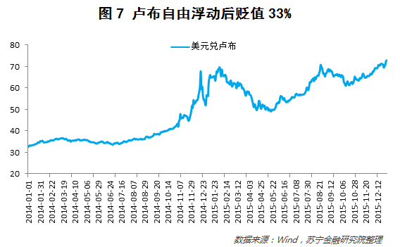 政策宣布后,俄罗斯卢布汇率经历自由落地式贬值,从2014年11月至2015年1月,两个月的时间里,卢布贬值33%。如果从2014年7月开始计算,那么卢布贬值幅度高达50%(参见图7)。