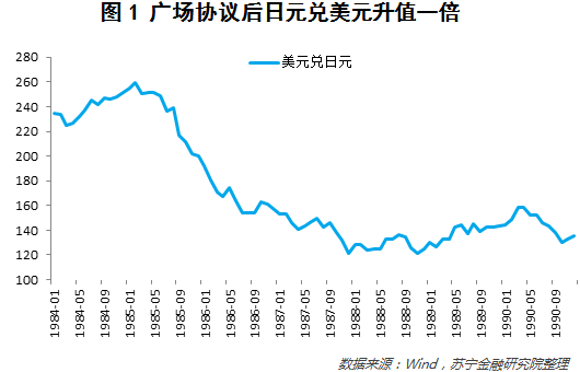 1985年9月,美国和日本等国家签订广场协议,决定通过日元升值来解决日本对美国的贸易顺差问题。从数据来看,日元兑美元从1985到1987年大约升值了将近一倍,从1美元兑换240日元升值到1美元兑换120日元附近(参见图1)。