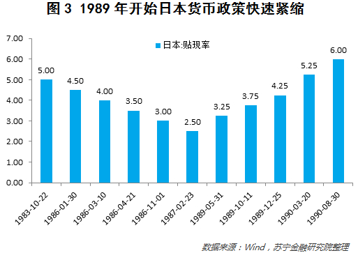 1989年5月开始,日本不断上调基准利率,贴现率从1989年初的2.50%快速上调至1990年初的5.25%,并在1990年8月大幅上调至6.00%(参见图3)。这意味着日本央行花了三年多的时间进行宽松,但只用了一年多的时间就紧缩回来了。