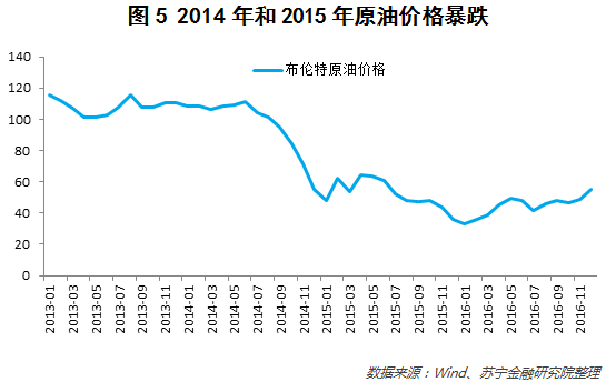 众所周知,石油是俄罗斯经济的支柱产业。石油及石油制品出口占俄罗斯出口总额的48%,而出口占俄罗斯GDP的27%左右。从2014年开始,随着原油需求走弱以及美国原油产量不断抬升,原油价格在2014年下半年出现暴跌,从2014年6月的111美元/桶跌至2016年1月的33美元/桶(参见图5)。