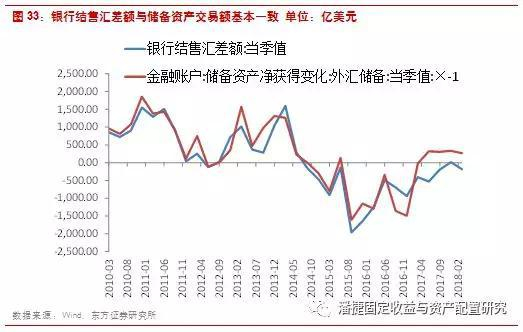 另一方面,差额反映了央行在外汇市场的干预。12年以来,强制结售汇制度退出历史舞台,二者差距增大。在12-13年人民币面临升值压力,储备资产增加幅度常高于结售汇差额。在16年下半年,储备资产下降规模大幅超出银行结售汇逆差,反映出当期央行直接在外汇市场上大量投放外汇。