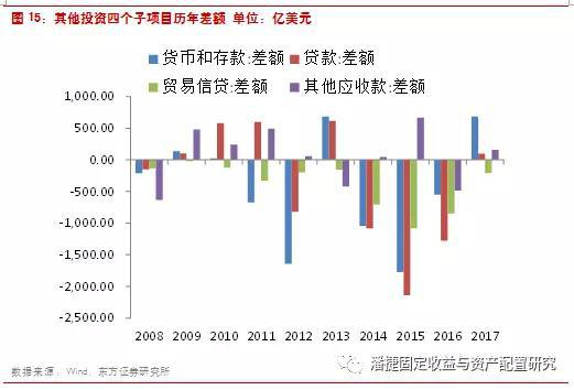 其他投资是金融账户中顺周期性最强,波动最大的科目。14-16年四个分项大多呈现出不同程度的流出。货币与存款项下资产是本国居民的外币存款,负债是外国居民的本币存款,受到存款汇兑损益预期的影响,敏感性较强。贷款项下资产是本国居民持有的债权,负债是本国居民的外债。贷款项下的流出主要是在人民币贬值预期下,企业偿还外币债务。贸易信贷资产包括本国进口商预付款,本国出口商提供给外国进口商的贸易信贷和出口应收款,负债与之相反。贸易信贷、其他应收款差额变化与贷款类似,主要是企业在人民币贬值预期下,“资产外币化,负债本币化” 顺周期财务运作形成的。