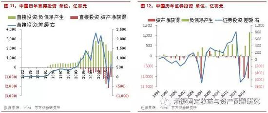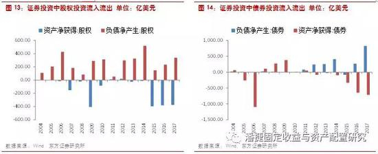 证券投资和金融衍生品。包括股权、债券、金融衍生品等形式的头寸。资产表示本国持有的国外非居民证券资产增加(资金流出)。负债表示本国对外发行的股票、债券等金融产品筹资额(资金流入)。股票市场多年以来外资每年流入规模变化不大,近年来债券市场对外开放步伐较快,2017年设立债券通,债券市场外资流入规模快速增长。对于国内投资于海外市场,管理层仍然较为谨慎,例如“债券通”先开通“北向通”后适时扩展至“南向通”。