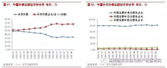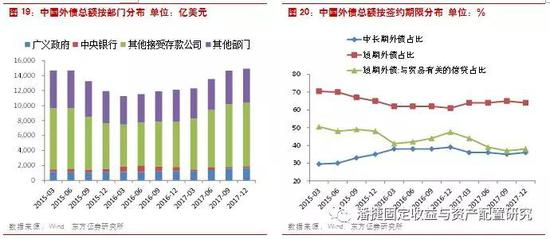 外管局同样公布了我国外债按部门、签约期限以及币种的分布。分部门来看,银行是外债占比最高的部门,2017年末外债规模8455亿美元;其次是企业及居民部门,2017年年末外债规模4555亿美元。分期限来看,17年年末短期外债占比64%,此处的期限分布按照签约期限,而非债务剩余期限。分币种来看,17年年末我国外债中67%为外币外债,且绝大多数是美元外债,17年以来外币外债占比有所上升。
