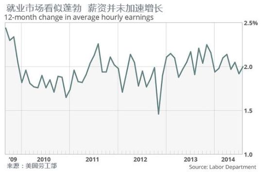 就业增长并未带动小时薪资出现大涨,即便2014年高收入岗位增势明显好于去年。但除非职工薪资有大幅增长,否则美国经济就不会录得长足进步。