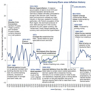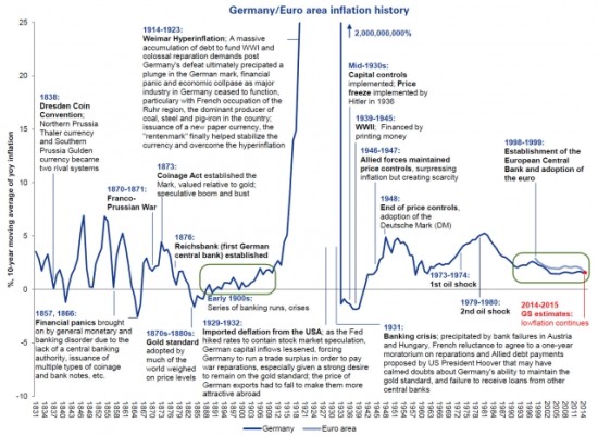 尽管低通胀横扫全球主要经济体,然而德国人仍然无动于衷。在欧洲央行决定是否实施QE应对欧元区的通缩风险之际,德国央行行长魏德曼再次表示反对。如果你跟随高盛的步伐回顾德国的通胀史,也许会明白德国为何反对“印钞”刺激经济: