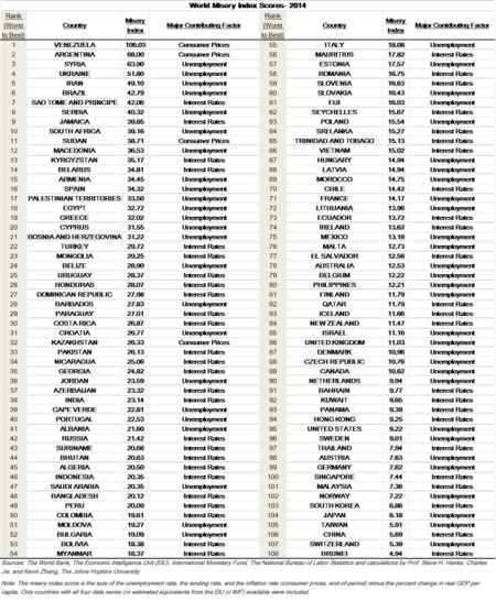 根据美国智库卡托研究所(Cato Institute)公布的2014年108个国家的悲惨指数排行榜,世界上最“悲惨”的国家是委内瑞拉,香港的悲惨指数为9.25,排在第94位,高于大陆的5.69(第106位)和台湾的5.91(第105位)。