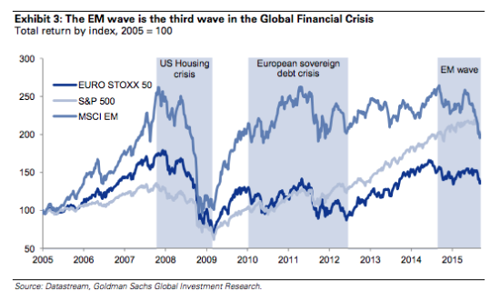 高盛认为,危机的不同阶段相互影响,对经济复苏构成阻碍,比如欧洲主权债务危机拖累了美国经济在2010和2011年的复苏,而如今新兴市场的危机也不合时宜地冲击了欧洲经济。