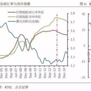 2008年-2009年间的实际有效汇率走低曾带动一轮房价绝对价格和同比增速的同时走低,那几乎是历史上唯一的一轮房价跌。在此后的2010-2014年间,房价整体随着实际有效汇率的高斜率攀升在节节上涨;其间增速随汇率二阶变化有所波动,但基本都是正值。