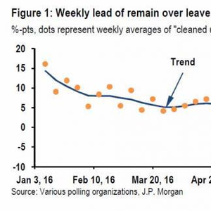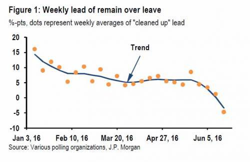 汇通网6月20日讯——英国脱欧公投已经进入倒计时。摩根大通近日在报告中写道,“随着英国公投即将来临,民调向脱欧阵营倾斜。”(见图1)最近,多项不同民调数据显示脱欧派占据领先地位。