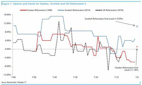 德意志银行高级策略师吉姆-瑞德(Jim Reid)对比了2014年9月苏格兰独立公投、1995年魁北克公投及目前的英国公脱欧投,并将民调领先趋势用曲线图标示出来。如下图:
